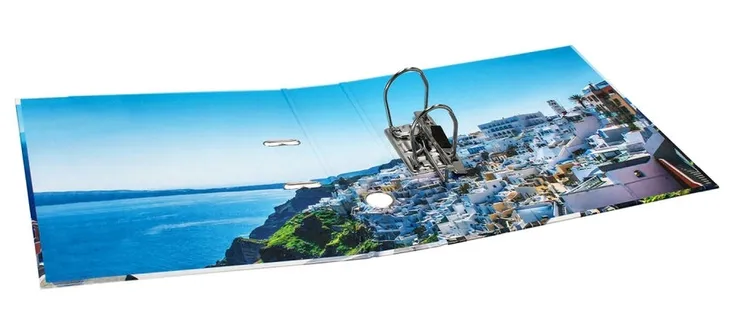 Całość segregatora, zarówno okładka jak i wewnętrzna wyklejka zostały pokryte grafiką przedstawiającą Santorini.